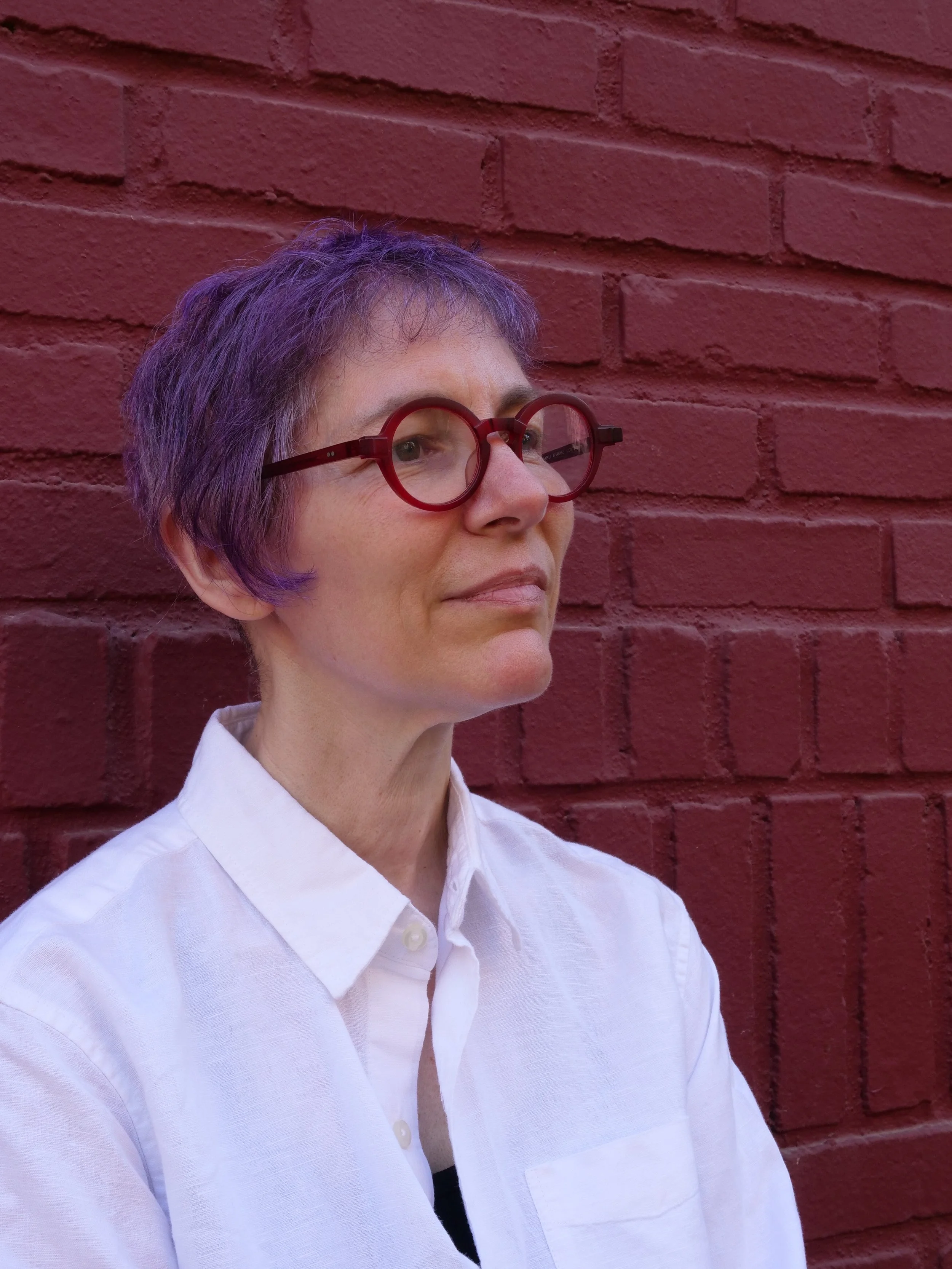Emma with short purple hair & red circular glasses in a white button-down against a red brick wall.